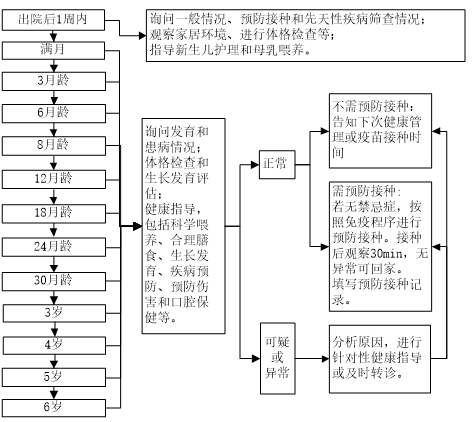 为4~6岁儿童每年提供一次健康管理服务。散居儿童的健康管理服务应在乡镇卫生院、社区卫生服务中心进行,集居儿童可在托幼机构进行。每次服务内容包括询问上次随访到本次随访之间的膳食、患病等情况,进行体格检查和心理行为发育评估,血常规(或血红蛋白)检测和视力筛查,进行合理膳食、生长发育、疾病预防、预防伤害、口腔保健等健康指导。在每次进行预防接种前均要检查有无禁忌症,若无,体检结束后接受疫苗接种。