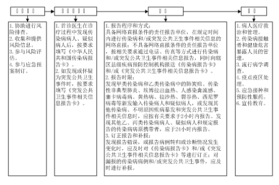 (一)乡镇卫生院、村卫生室和社区卫生服务中心(站)应按照《中华人民共和国传染病防治法》、《突发公共卫生事件应急条例》、《国家突发公共卫生事件应急预案》等法律法规要求,建立健全传染病和突发公共卫生事件报告管理制度,协助开展传染病和突发公共卫生事件的报告和处置。
