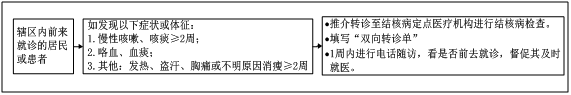 对辖区内前来就诊的居民或患者,如发现有慢性咳嗽、咳痰≥2周,咯血、血痰,或发热、盗汗、胸痛或不明原因消瘦等肺结核可疑症状者,在鉴别诊断的基础上,填写“双向转诊单”。推荐其到结核病定点医疗机构进行结核病检查。1周内进行电话随访,了解是否前去就诊,督促其及时就医。