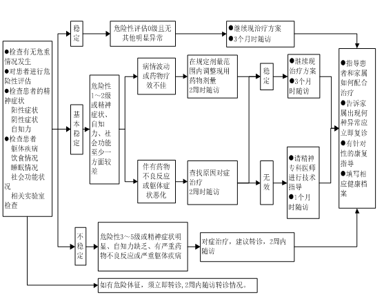 2.病情基本稳定患者。若危险性为1~2级,或精神症状、自知力、社会功能状况至少有一方面较差,首先应判断是病情波动或药物疗效不佳,还是伴有药物不良反应或躯体症状恶化,分别采取在规定剂量范围内调整现用药物剂量和查找原因对症治疗的措施,2周时随访,若处理后病情趋于稳定者,可维持目前治疗方案,3个月时随访;未达到稳定者,应请精神专科医师进行技术指导,1个月时随访。